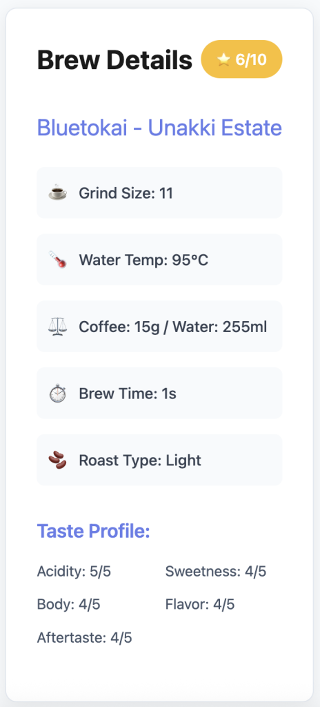 The breakthrough came from recognizing that brewing optimization isn’t just about analyzing your own data—it’s about understanding the relationships between parameters across different methods, roast types, and personal preferences. This led to building what we internally call the “Brewing Brain.”